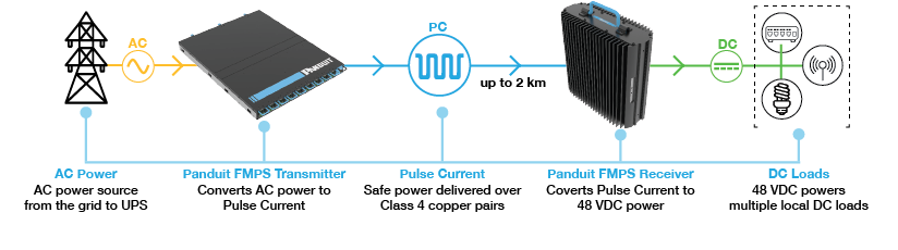 The FMPS uses Pulse Current as its power delivery method. The Transmitter converts standard AC power into high voltage DC power, which is further converted into a Pulse Current waveform delivered over a Class 4 multi-conductor copper cable to the Receiver. The Receiver converts the pulse current waveform into +/- 48 VDC power, which can power multiple end devices.